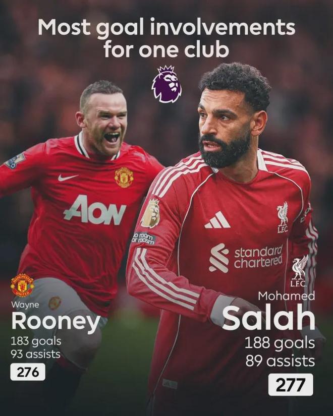 开场仅46秒,22岁的法国前锋埃基蒂克抽射破门,点燃了安菲尔德。第60分钟,萨拉赫开出角球,埃基蒂克头球梅开二度——这是萨拉赫利物浦生涯第89次助攻,加上188个进球,他以277次参与进球的数据,超越鲁尼,成为英超历史“单一俱乐部参与进球之王”。